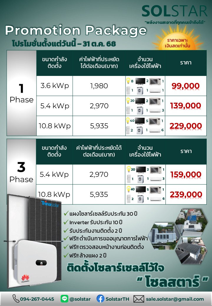บริษัท โซลสตาร์ จำหน่าย ออกแบบ และติดตั้งระบบโซลาร์เซลล์แบบครบวงจร แพคเกจโซลาร์เซลล์ของเราติดตั้งได้บนอาคารทุกประเภทไม่ว่าจะเป็น บ้านเดี่ยว ทาวน์โฮม หรืออาคารพาณิชย์ หลังจากติดตั้งแล้ว คุณจะลดค่าไฟฟ้าได้ทันที และหากมีไฟฟ้าเหลือ ยังสามารถขายคืนให้การไฟฟ้าได้อีกด้วย ทีมงานฝ่ายขายและทีมวิศวกรของเราพร้อมให้คำปรึกษาและให้บริการ สามารถสอบถามข้อมูลได้ตลอดเวลา